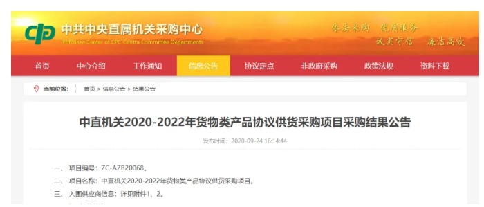 2020年9月24日,中共中央直属机关采购中心发布“中直机关2020―2022年货物类产品协议供货采购项目采购结果”公告。