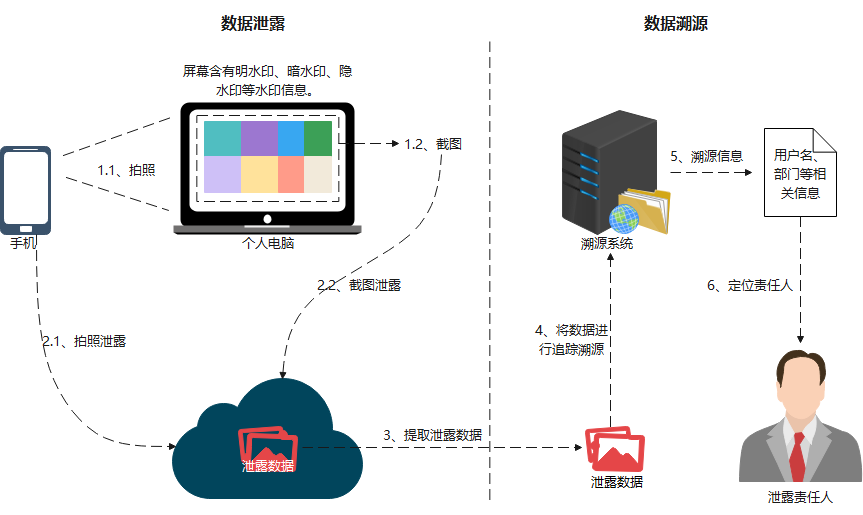 数据发生泄露可能会给企事业单位造成无法估量的损失,但是如何追溯数据泄露的直接责任人却成为一个难题。当前电脑、智能手机的普及,都为数据泄露提供了便捷的条件。数据泄露人员只需要使用手机进行拍照就可以将企事业单位的一些核心机密信息带走,如果这些信息发布到网络上,就会给企事业单位带来很大的负面影响。然而由于缺乏有效的措施,这些数据泄露人员很难追查到,最终成为无头案,企事业单位只能默默承受损失。所以,如何对数据泄露进行溯源追责,进而从源头上对数据泄露行为达到强有力的威慑力,已经成为各企事业单位的重点关注方向。
